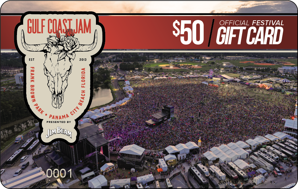 Gulf Coast Jam Gift Cards may be only purchased from GulfCoastJam.com and from authorized third-party distributors. Gift Cards will be fulfilled alongside Gulf Coast Jam wristbands for the 2025 Gulf Coast Jam music festival. GC’s may arrive in a separate delivery from the wristbands depending on the purchaser. (If a parent buys their kid a GC, but the parents aren’t coming to the festival, then the GC will be shipped separately from the ticket order due to it being a separate order. Gulf Coast Jam Gift Cards are not valid if purchased from any other seller. Gulf Coast Jam Gift Cards are redeemable only for purchases of goods and services at select participating merchandise and food locations at the Gulf Coast Jam Music Festival. Gulf Coast Jam Gift Cards may not be used towards the purchase of Gulf Coast Jam tickets, lodging or event packages except they may be used towards the on-site upgrade of a previously purchased ticket credential or tickets for the 2026 Guld Coast Jam music festival (if on sale). Gulf Coast Jam Gift Cards may not be used towards the purchase of Cards.
